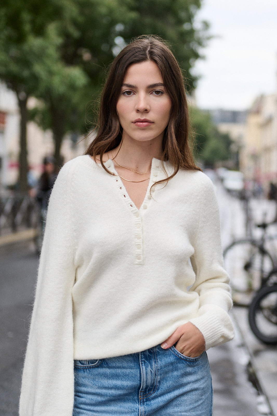 Pulover elegant pentru femei din amestec de lana si alpaca, cu maneci lungi usor bufante si decolteu rotund cu placheta de nasturi. Textura fina si moale, cu finisaje tip rib la guler, mansete si tiv pentru un plus de eleganta. Nasturi ton pe ton pentru un aspect rafinat si minimal.